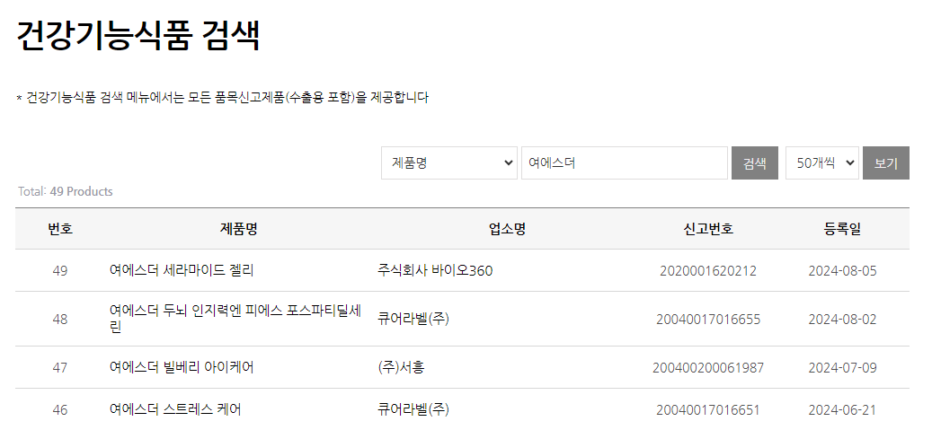식품의약품안전처에서는 건강기능식품에 대해 따로 추적관리하고 있어서 식품의약품안전처에서 운영하는 식품안전나라 사이트에서 건강기능식품으로 인정된 건강기능식품을 검색해볼 수 있습니다.