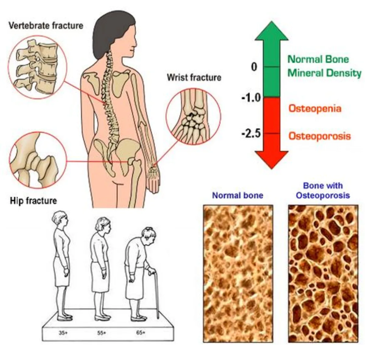 자주 발생하는 골절: 골다공증은 뼈가 약해져서 상당히 작은 충격이나 부담에도 골절이 발생할 수 있습니다. 특히 골반, 척추, 손목의 골절이 가장 흔하게 나타납니다.