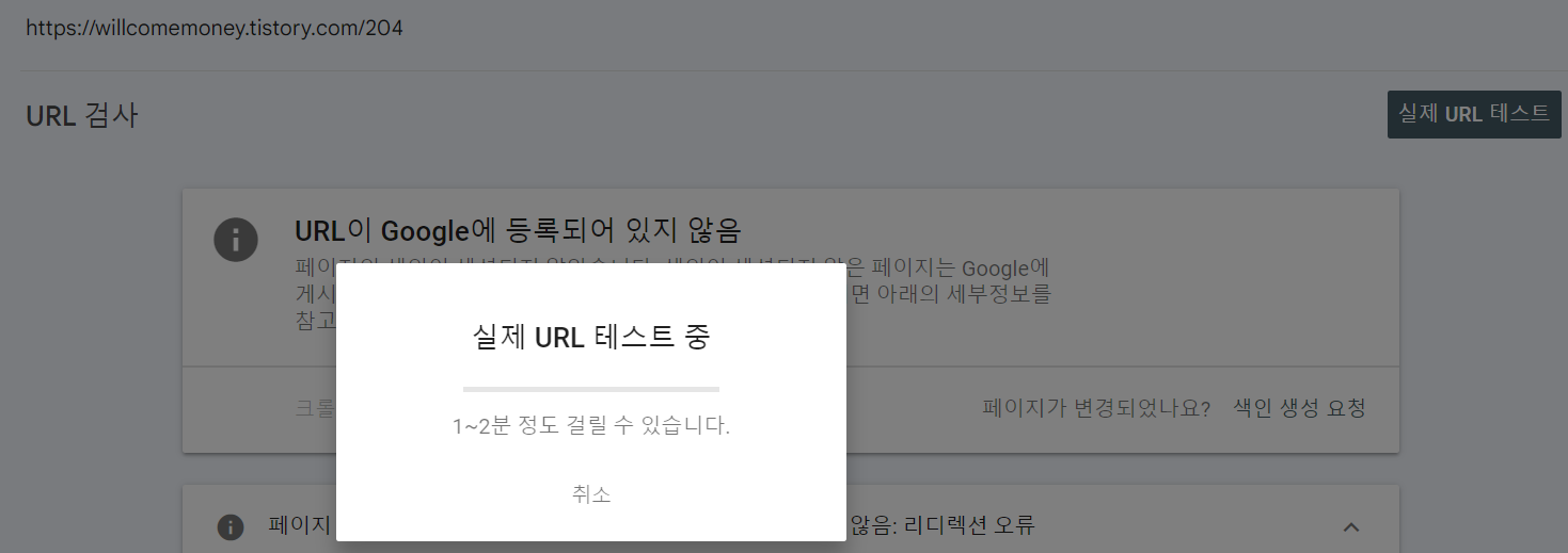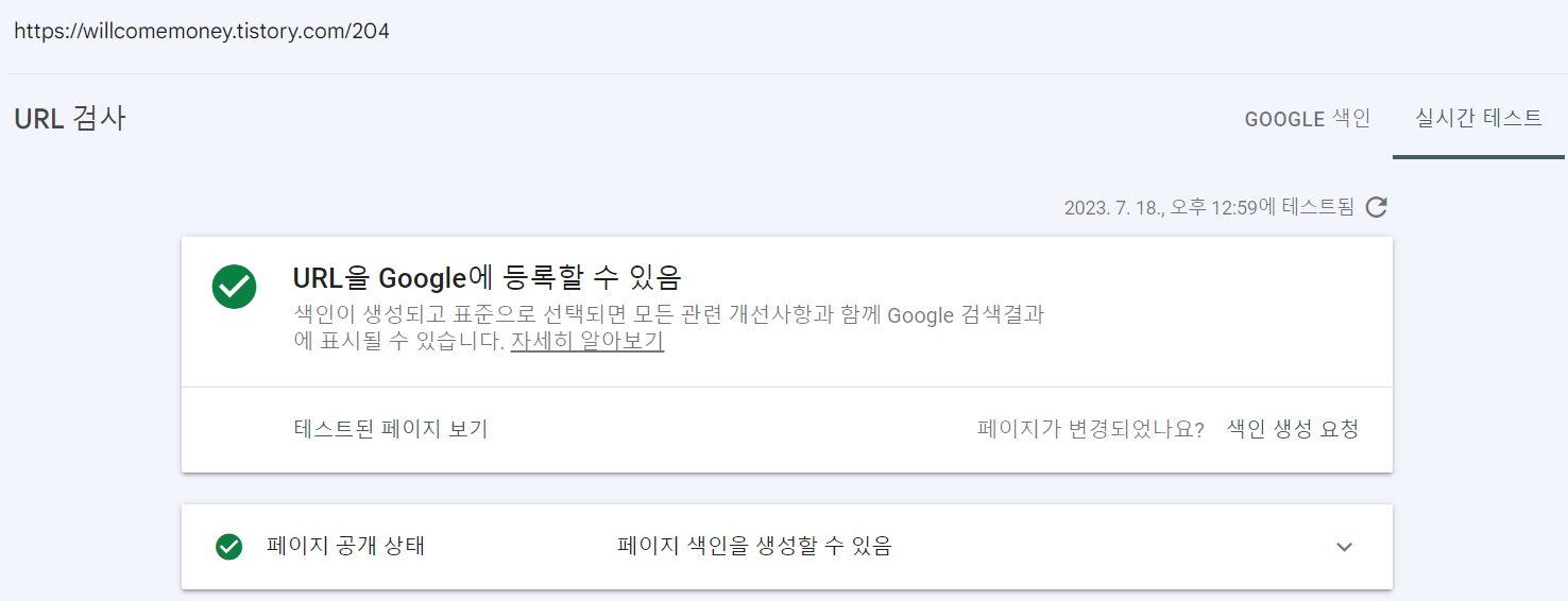 색인 생성 요청은 아주 간단합니다. 색인이 생성되지 않은 URL을 선택해서 URL 테스트를 진행한 뒤 문제가 없다면 바로 구글에 색인 생성 요청을 진행 할 수 있습니다.