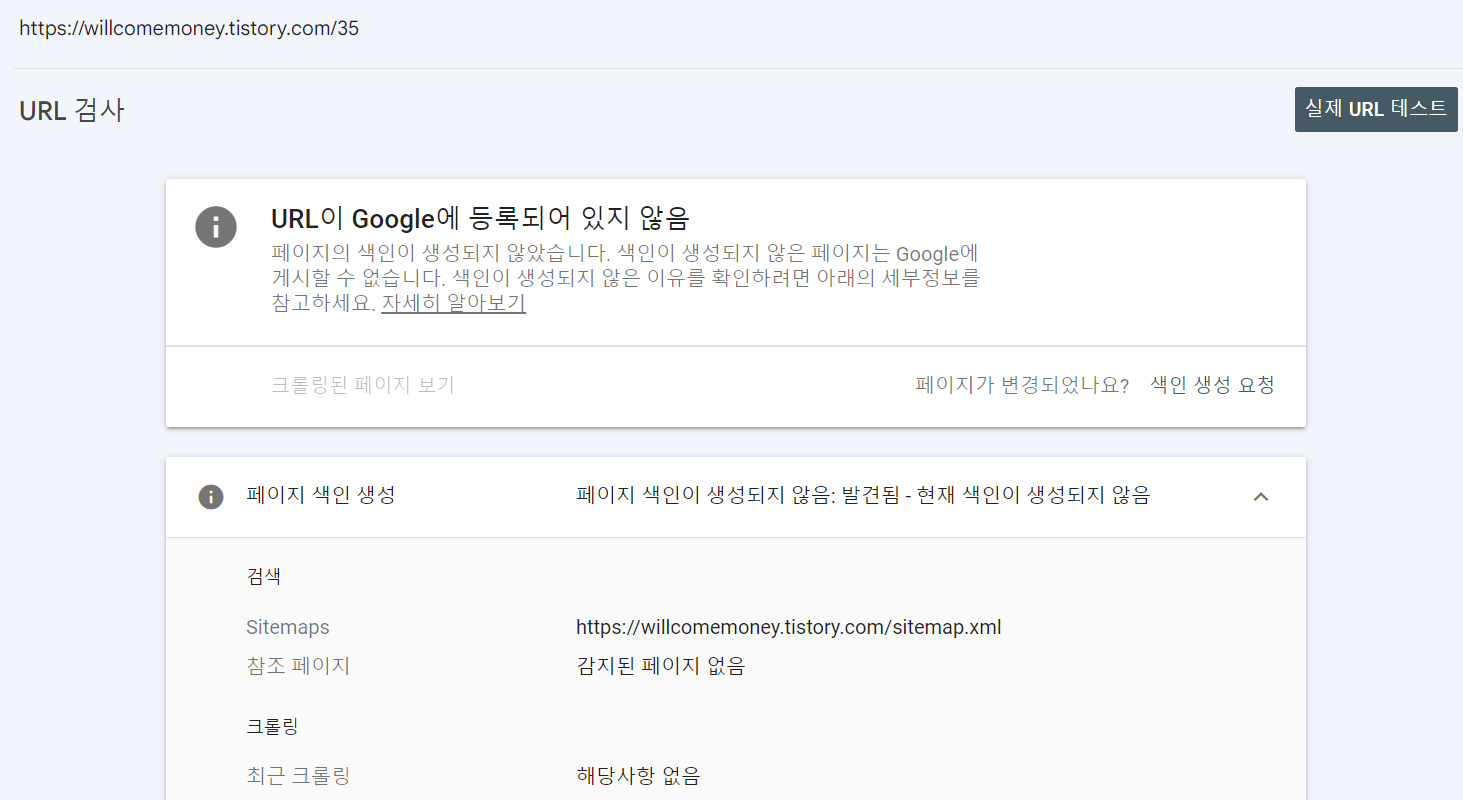 문제가 제대로 해결되었다면 위와 같이 URL을 Google에 등록할 수 있음 이라는 코멘트를 확인 할 수 있습니다. 문제가 해결되었다면 색인 생성 요청 버튼을 눌러서 구글에 문제가 해결된 포스트 URL을 등록 요청하면 됩니다.