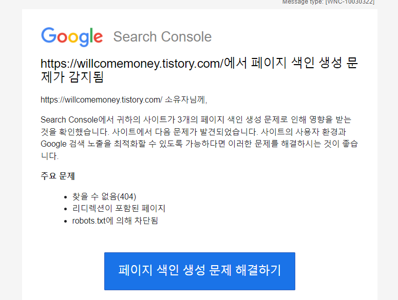 이메일을 자주 확인하시는 분들이라면 놓치지 않고 해결 하실 수 있겠지만 그렇지 않은 분들이라면 참고하시면 좋을것 같습니다. 포스팅한 글 수에 비해서 구글이나 다음 네이버 등 검색엔진에서 유입이 낮게 나온다면 구글서치콘솔에서 페이지 확인을 해보시는 것을 추천드립니다.