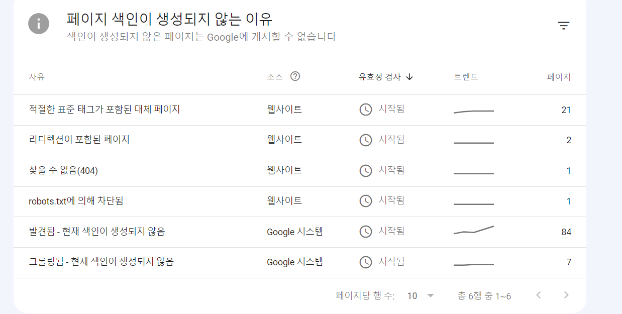 구글서치콘솔에서 페이지 색인이 생성 문제로 수정요청을 하고 시간이 꽤 지난 상황(대략 4~5일정도)이지만 유효성 검사는 여전히 시작됨으로만 표시되고 처리가 안되고 있다. 셀프로 직접 URL의 문제를 테스트 하는 기능이 있어서 직접 테스트했을때는 문제가 없어서 색인 생성이 가능하다고 나오지만 수정요청을 하고 나서 처리는 상당히 시간이 오래걸리는 것 같습니다. 구글이 워낙 방대한 양을 처리하기 때문에 그렇겠지만 블로그를 운영하는 입장에서는 하루라도 빨리 작성했던 포스팅이 어딘가에는 노출되어야 이익인데 그렇지 못해서 한편으로는 답답한 마음도 생기긴 합니다.